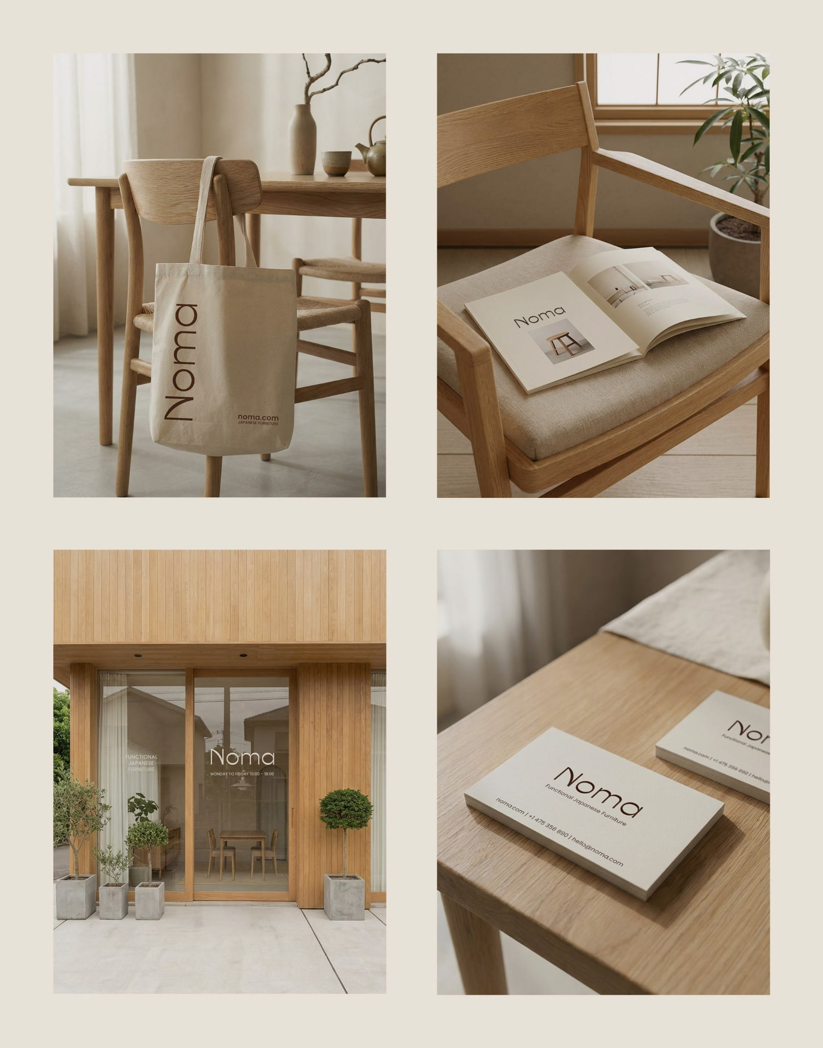 The brand design is built to feel like stepping into a quiet Japanese room: calm, warm and carefully stripped back. Everything works from the same principles as the furniture: soft geometry, honest materials and plenty of space around things. The wordmark is a clean, rounded sans serif set with generous letterspacing, echoing ma (間), the Japanese idea of the space between objects, so the logo never shouts. It just sits confidently in place.